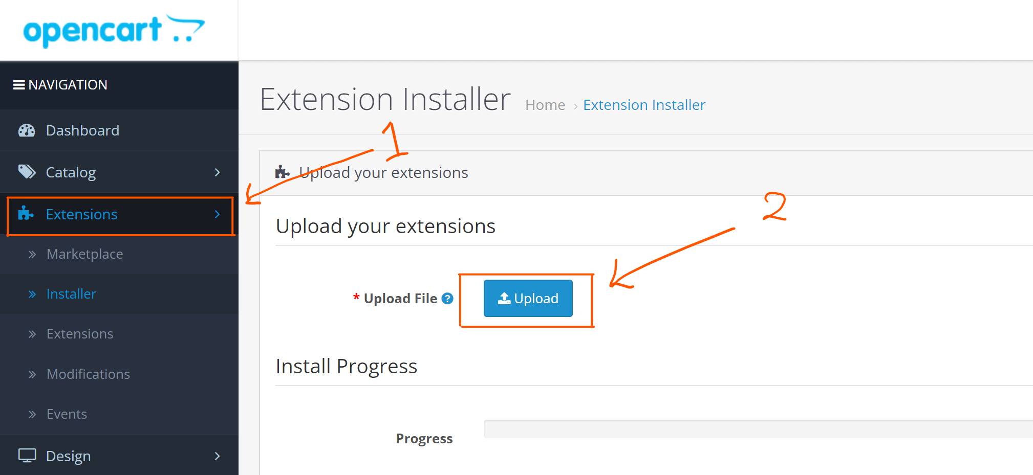 Extensions->Extension Installerand click the Upload File button to upload the previously downloaded zip file.