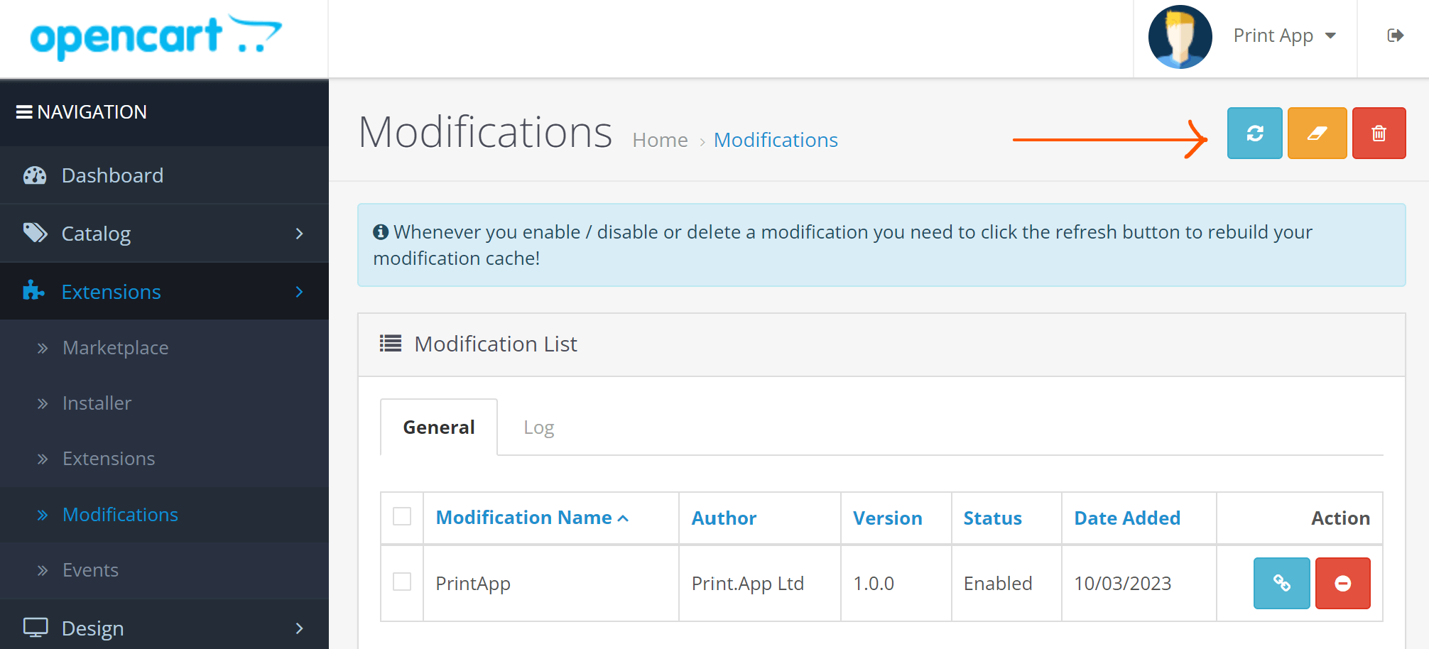 Extensions->Modificationsand hit the refresh modifications buttonYou also need to refresh your store theme. To do that, navigate to